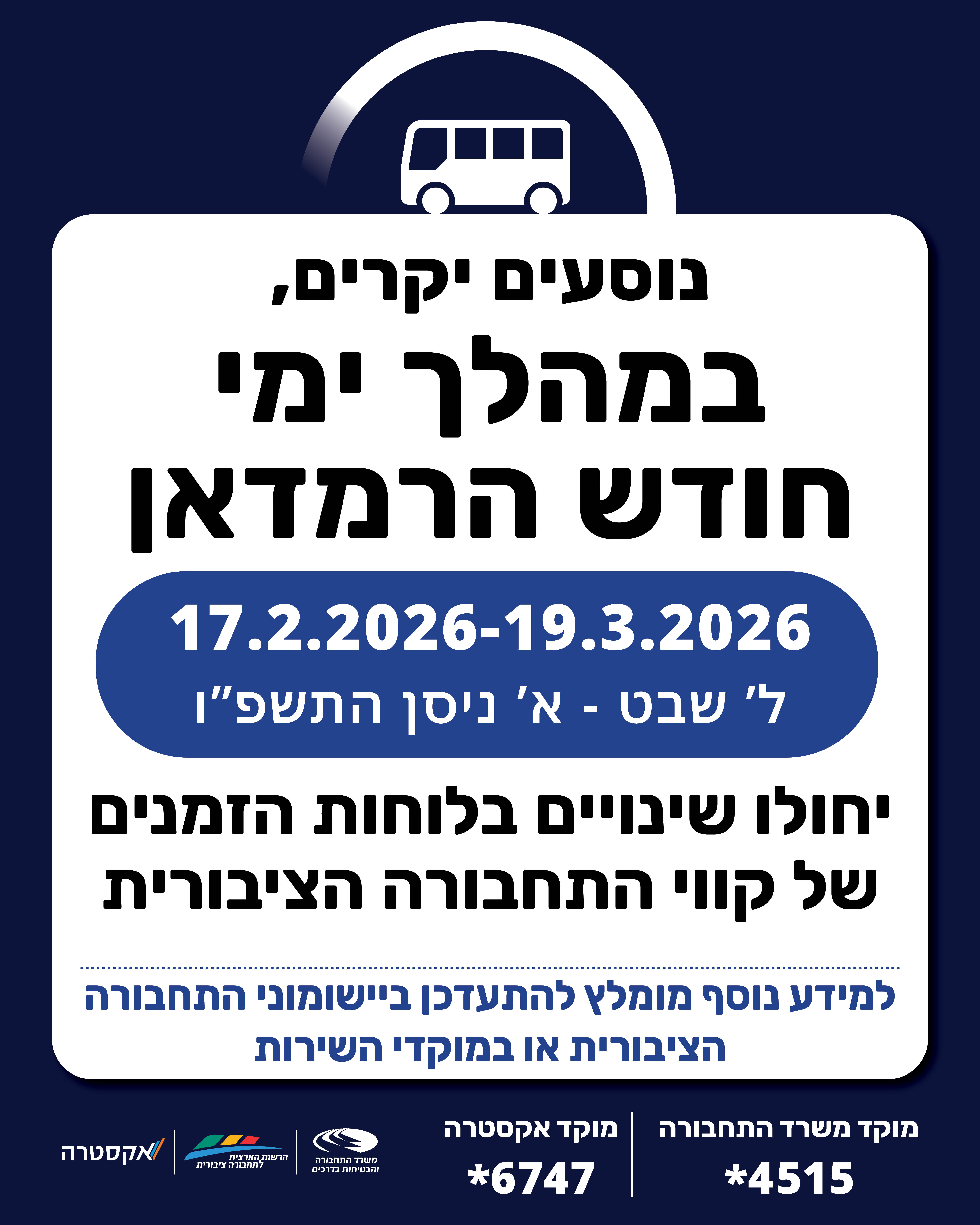 במהלך חודש הרמדאן, בין 18.2.2026 ל-19.3.2026 צפויים שינויים בלוחות הזמנים.